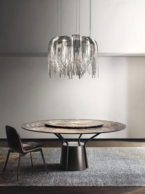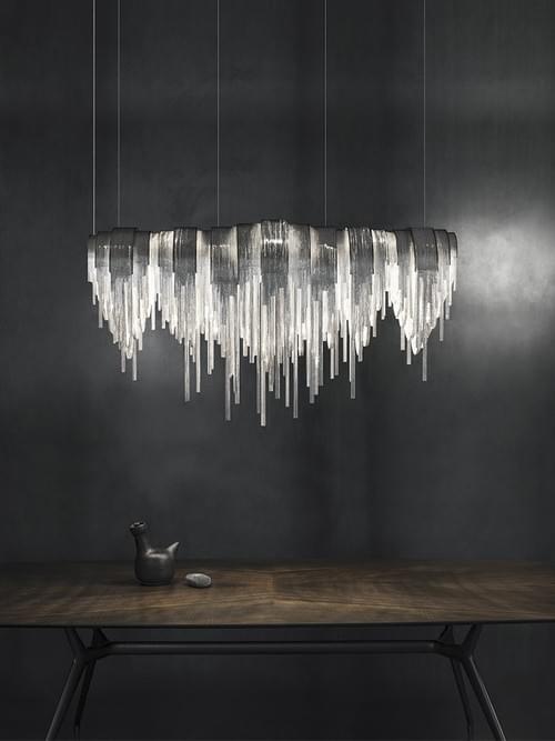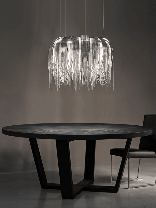 An artistic lighting sculpture where light cascades like liquid metal. This designed chandelier transforms your space into a gallery of soft shadows and sparkling reflections.