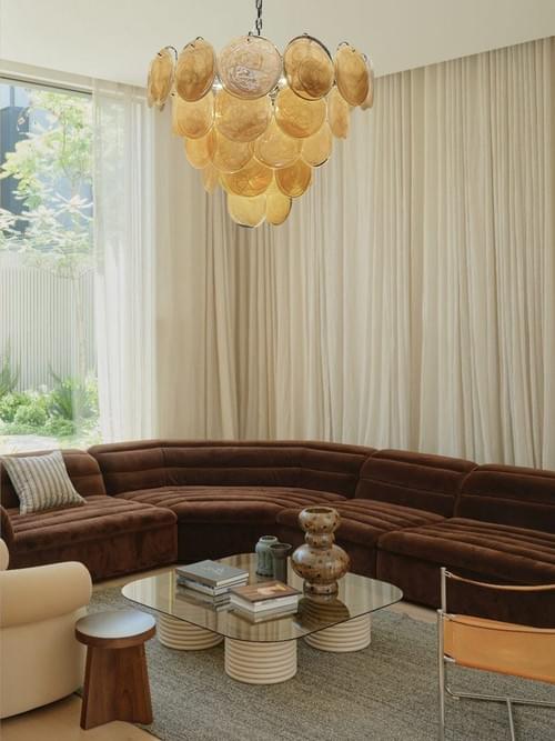 1.A stunning cascade of handcrafted glass discs creates a dynamic play of light and shadow.